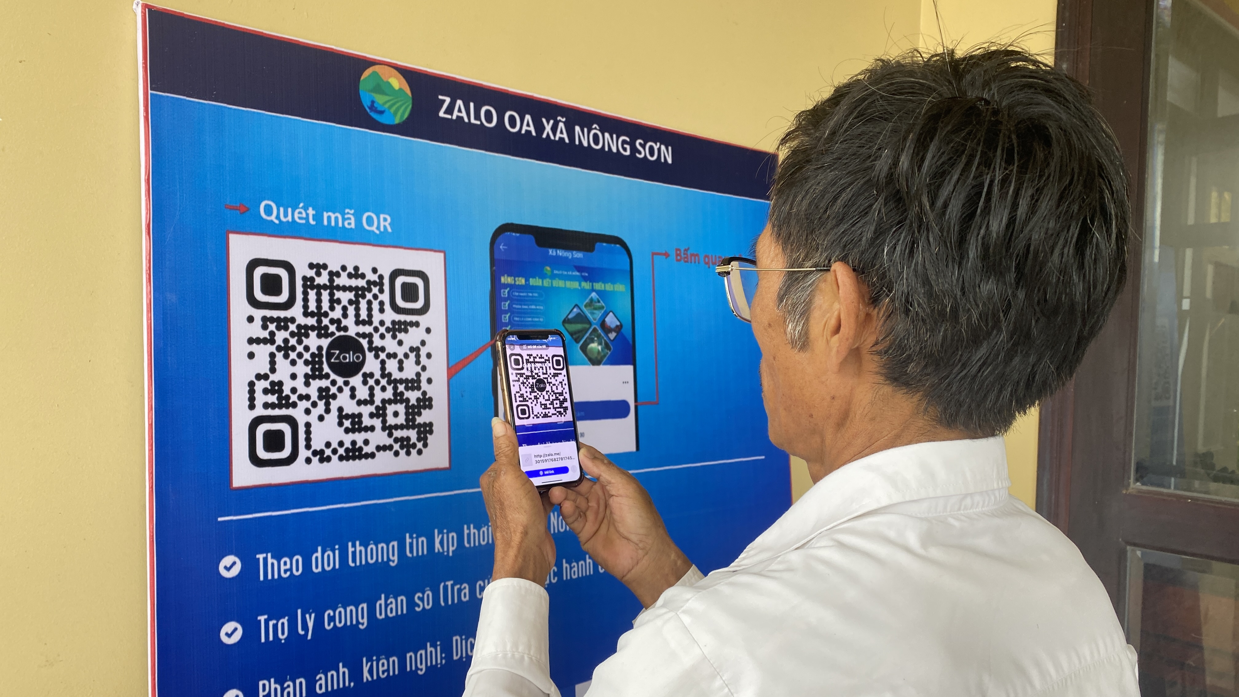 Ông Cao Tấn Hương, Chi hội trưởng Hội Nông dân thôn Phước Bình quét mã QR để cập nhật thông tin của địa phương