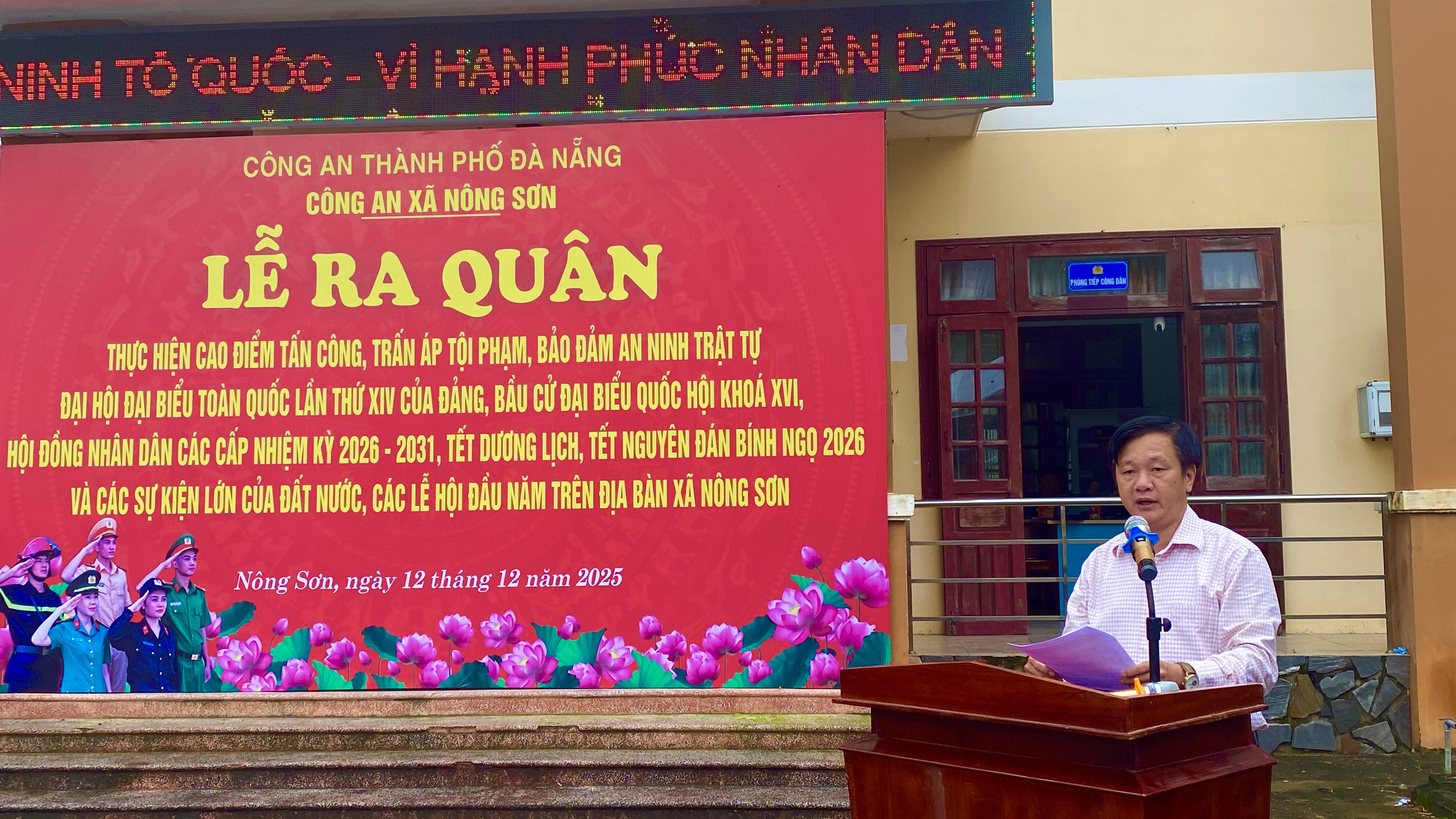 Phát biểu tại lễ ra quân, Trưởng Công an xã Nông Sơn, Trung tá Đỗ Viết Hạnh cho biết trong năm 2025, tình hình an ninh trật tự trên địa bàn cơ bản giữ vững ổn định, song vẫn tiềm ẩn nhiều yếu tố phức tạp như tội phạm trộm cắp, lừa đảo qua không gian mạng, tệ nạn ma túy, đánh bạc, vi phạm về pháo nổ, các hành vi cố ý gây thương tích, gây rối trật tự công cộng... “Bước vào cao điểm Tết Nguyên đán và trong bối cảnh năm 2026 diễn ra nhiều sự kiện chính trị quan trọng, Công an xã xác định nhiệm vụ bảo đảm an ninh trật tự là trọng tâm, đòi hỏi tinh thần trách nhiệm cao, sự vào cuộc đồng bộ của các lực lượng và sự đồng lòng của nhân dân”, Trưởng Công an xã nhấn mạnh.